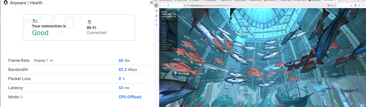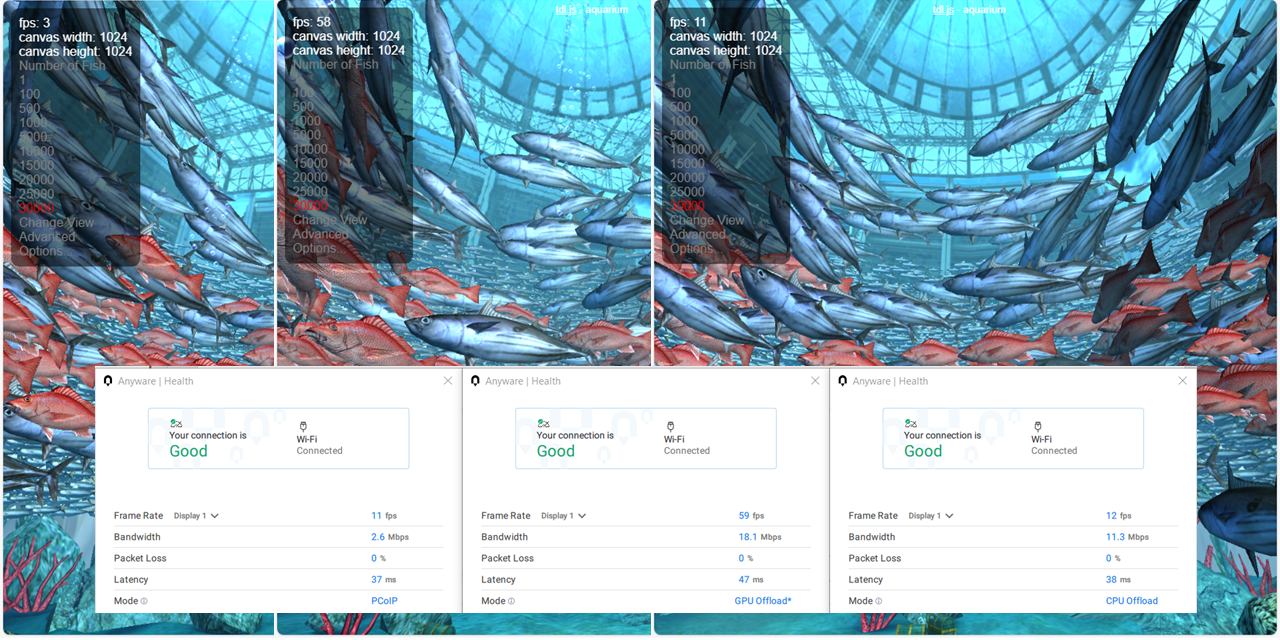 The below results is from a client running three WebGL sessions simultaneously towards a Windows 11 VDI, HP Z2 mini G1i and HP Z2 mini G1a at our HQ in Täby from our remote office in Roslagen, near Sweden Central, using PCoIP, GPU Offload and CPU Offload ie. by using a cheap Laptop PC!