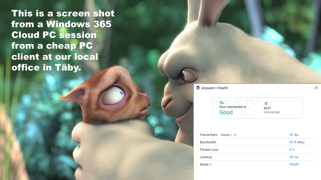 These results is from a client running a video session towards a HP Z2 mini G1i at our HQ in Täby from our remote office in Roslagen, near Sweden Central ie. by using a cheap Laptop PC!